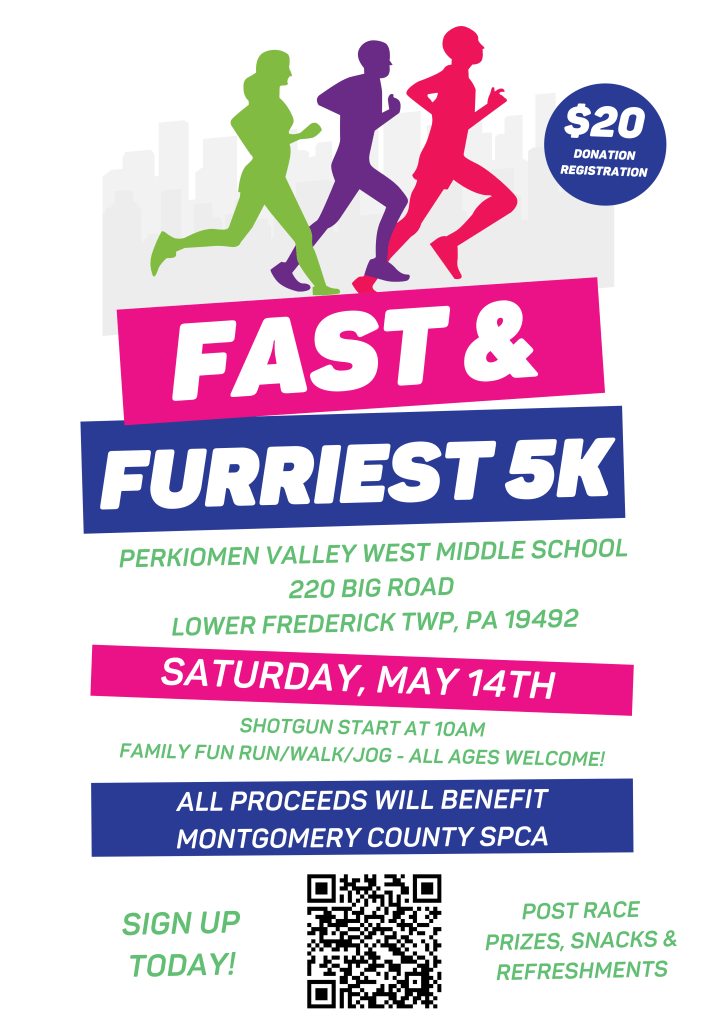 For those who are close by, the Fast and Furriest run is May 14th at Perkiomen Valley Middle School West. A $20 donation gets you a ticket. Proceeds go to the Montgomery County SPCA. The flier below has a QR code to get you to the Eventbrite to purchase your ticket. You can also click here.