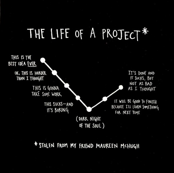 Perhaps the hardest thing in leading project-based work is knowing when to help students who are stuck, struggling, and feeling as if the world is collapsing on their project. While this is, at least according to Austin Kleon’s borrowed graphic, seemingly inevitable, and while my own experience in leading three years worth of NOVA Lab classes would bear out the truth of this observation, it doesn’t obviate the need to know when and how to help students see their way to completing a project that is, if not exactly what they’d hoped for, at least better than abandoning their work altogether.