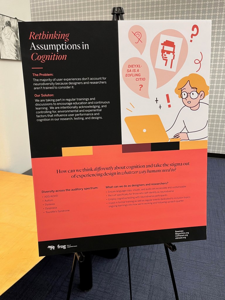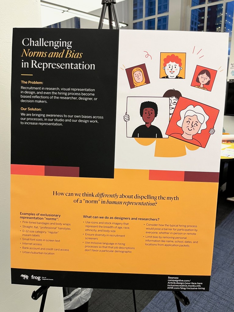 But further, the impact on NOVA Lab of my experience at frog is clear now and will be implemented in our next design sprint for Build.org’s “Build, Design Challenge.” This challenge features five potential clients, all real, diverse people in real and diverse situations. While we have always begun our designs by engaging in empathy interviews and developing insights from those collaborative observations, his year, I will be sure to teach the basics of inclusive design such that whatever entrepreneurial solutions students may develop for their clients, they will be informed by the principles of inclusive, universal, accessible design.