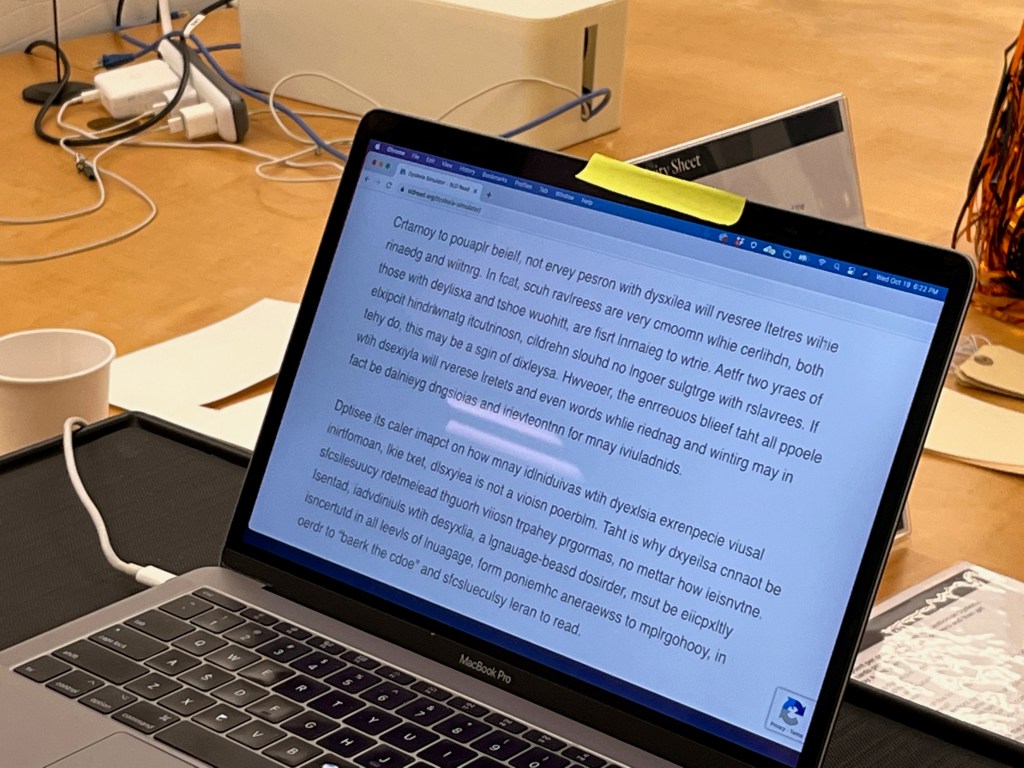 Further into the experience, we had the opportunity to read aloud a block of text with flickering and changing letters, thus asking us to step into a situation faced by dyslexic people every day. I tried to capture the different stations below.