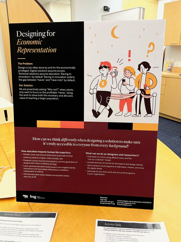 Designing for an immersive experience, frog crafted some simple and effective experiences, coupled with informative graphic placards and a “ticket reward system” to not only help visitors experience what it is like to “live in a world that is not designed for you,” but to realize the vast amount of privilege most of us carry in this world.