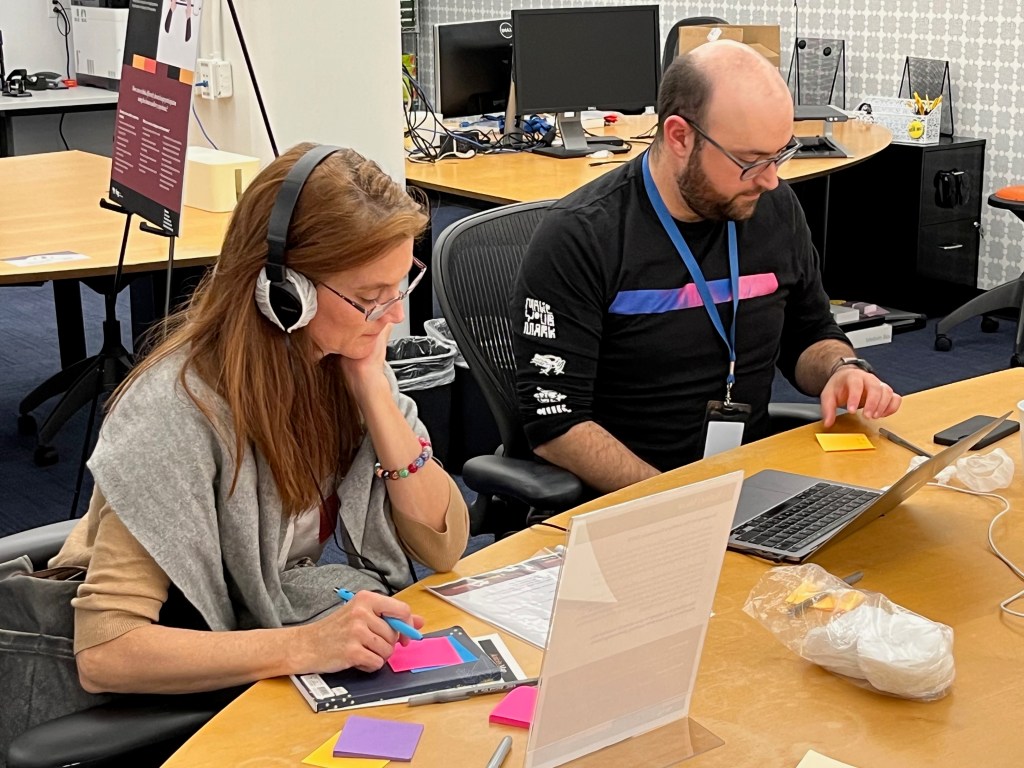 Each station/experience was geared towards a different type of neurodiverse situation or consequence thereof. One station asked us to listen to an informative recording in order to answer questions afterwards–except the recording was actually two tracks layered on top of each other. This station was geared towards helping us build empathy for those who experience auditory processing issues.