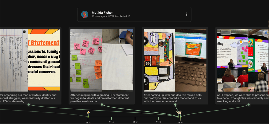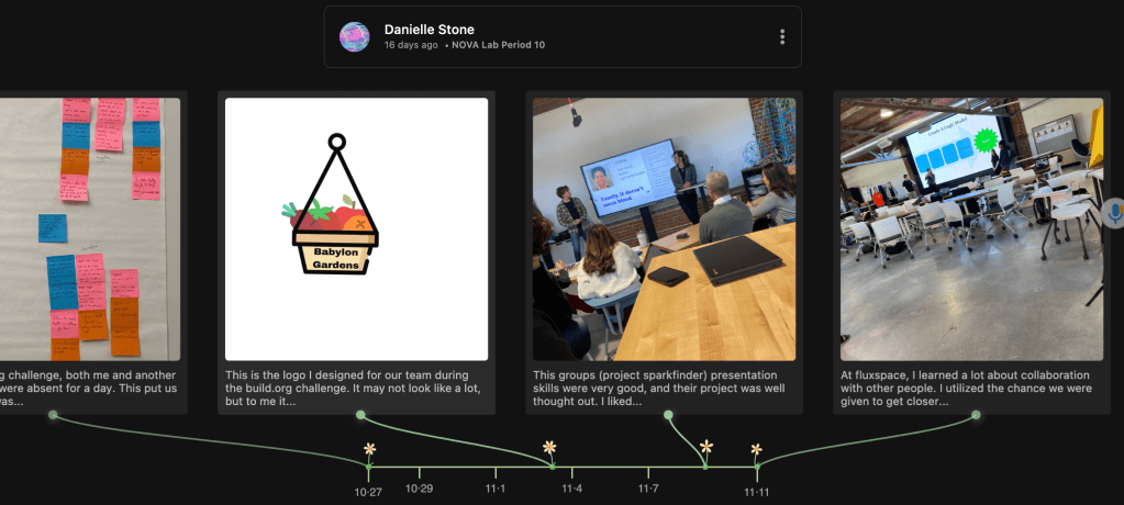 Below: A journey tracking a student on a design team as they get their first deep experience in moving through a design thinking cycle. Each journey is made up of separate “moments” created on different days. (This post tracks student learning through build.org‘s “Build Design Challenge.” See our reports on this challenge from last year’s class for more information.)