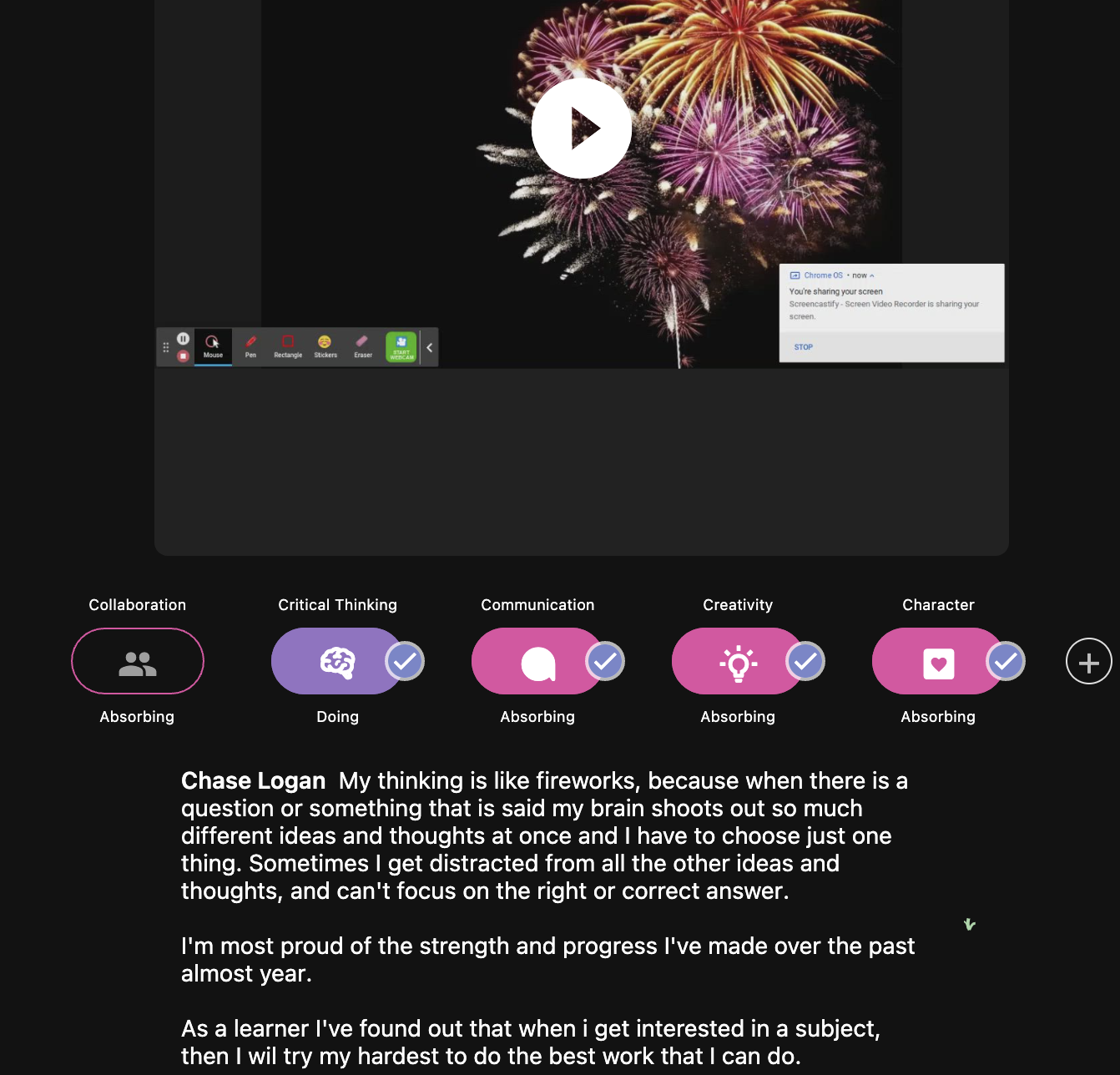 These proved hard to monitor and were, according to the students, tedious at best. My next move? I switched to weekly student 3-2-1 videos (thanks to Don Wettrick for this tip): 3 things they accomplished, 2 things they still need to do/failed at, and 1 thing they will take with them as a learning point. But, even these simple videos provided little insight into student needs and progress…though they were better than most other methods. Nevertheless, getting students to create a library of these videos and store them somewhere that was accessible to me and to the public at large…even if those were on their blogs…often proved more trouble than it was worth for students and me.