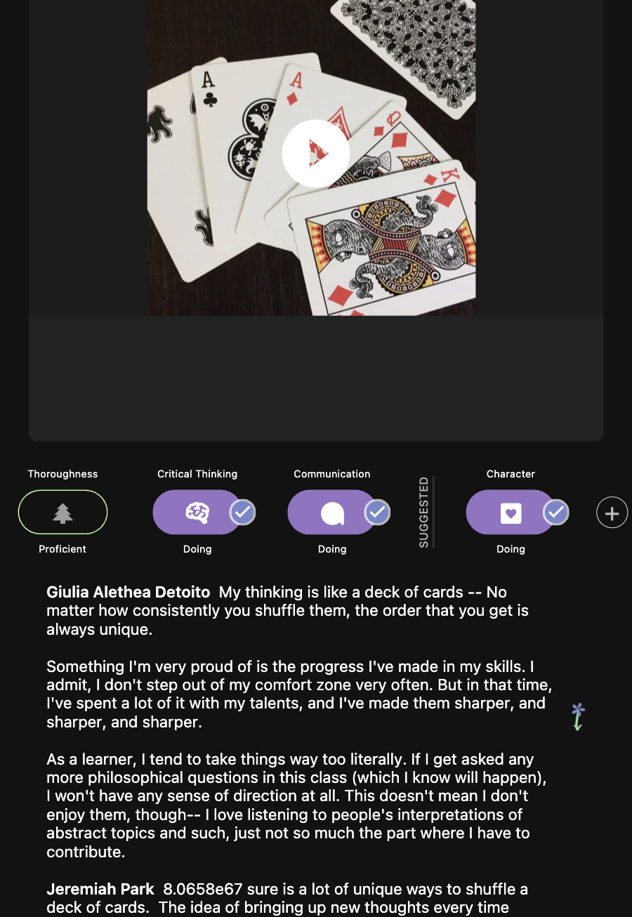 What I realized through all of this is that the majority of my well-intentioned attempts to have students reflect were more about me and justifying the methods of the class rather than helping students learn what they were learning about themselves, which is, so far as I can tell, the ultimate end of such a class…and learning in general. Even my end-of-the-marking-period conference documents, while often beautifully written and thoroughly evidenced, were week-long reconstructions of things done weeks prior, and thus largely a construct of failable memory and wishful thinking…never as authentic or real as they could have been.