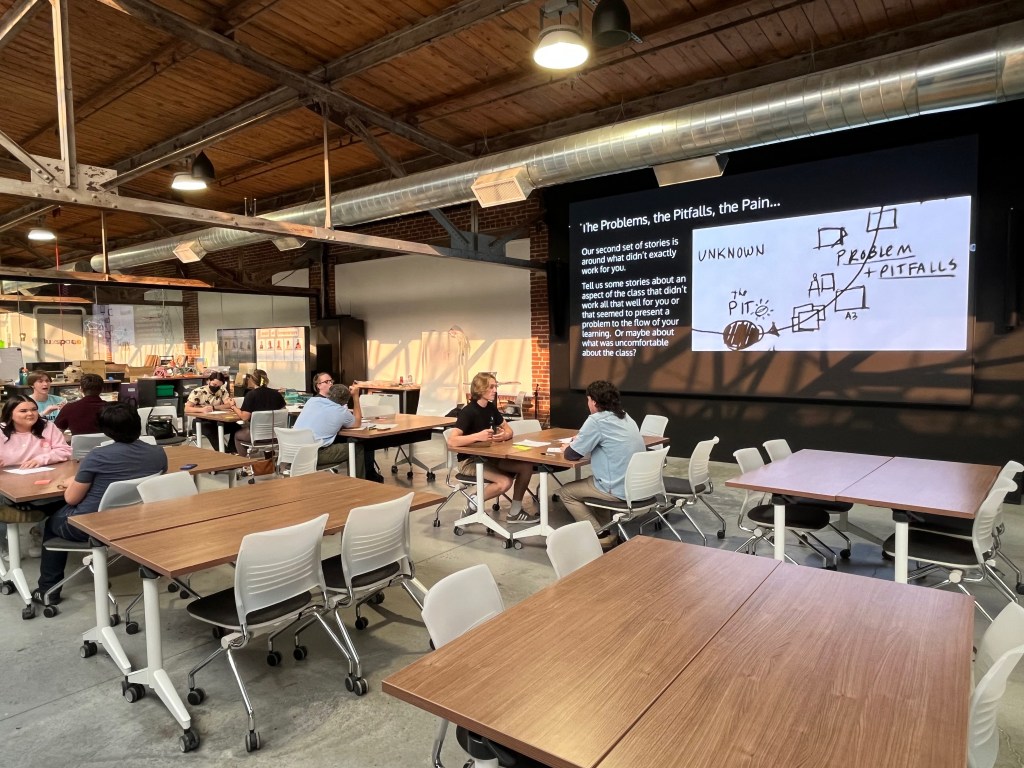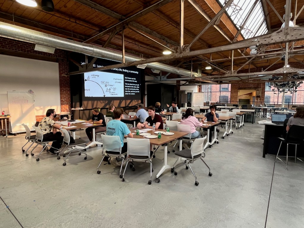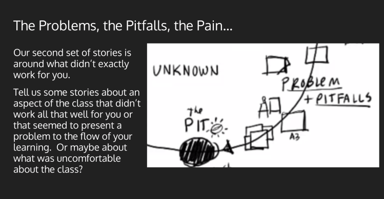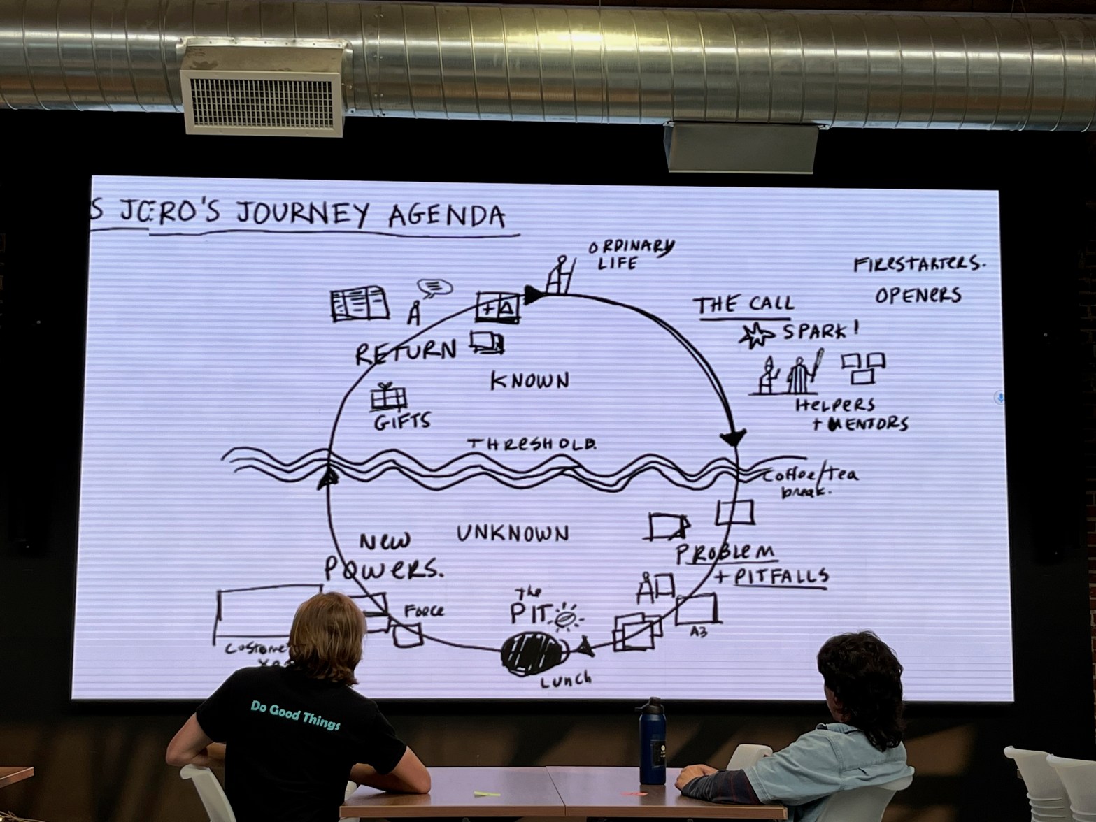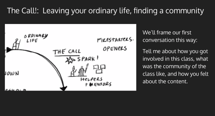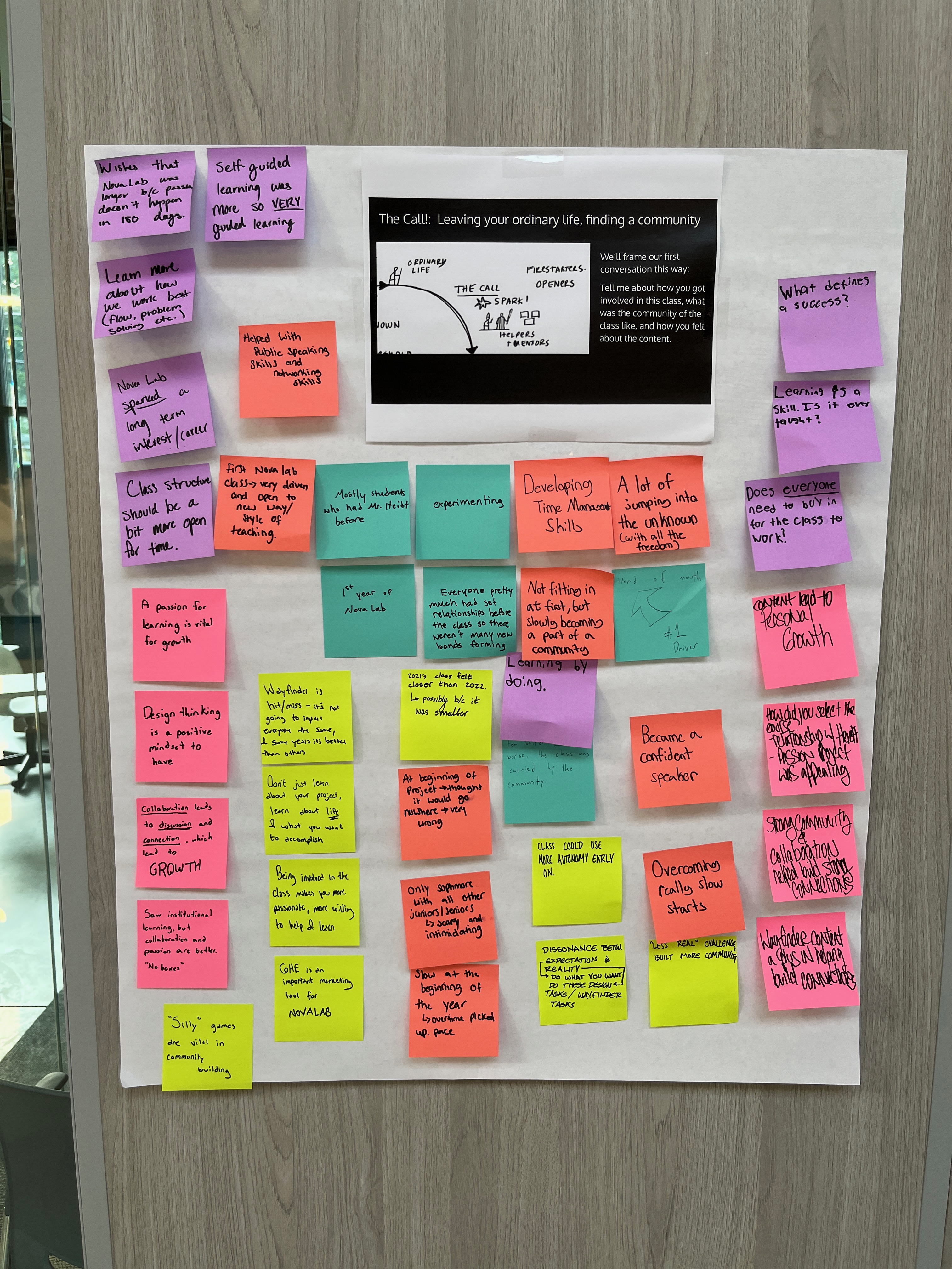 The second event was an evening meeting, with pizza!, at Fluxspace. I envisioned this meeting as a way to “reach back in order to move forward” and it involved gathering students from the first year of NOVA Lab and students currently in the class and then putting them into intergenerational, conversational pairs to engage in meaningful dialogue around particular questions. The questions were shaped around different quadrants of the Hero’s Journey and sought to discover the value students gained from their participation in the class as well as the problems they encountered. (See slideshow below.)