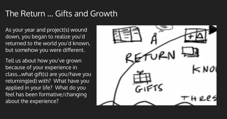 In the end, these 12 students, these six conversations are all the navigational assistance I require. Due to their insights, the methods for our journey in this class will shift; however our ends will be the same. And while the waters we enter will always be new, the heroes on this learning journey will always be new, we know where we are headed. Our North Star is bright and true.