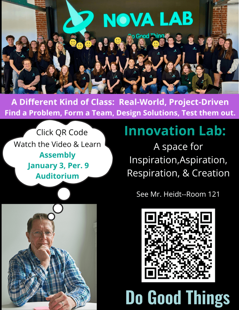 Second, a group of 12 former NOVA Lab students from the initial class in 2019 through our 2023 classes helped to pitch the course to an audience of interested students. Initiated last year as a way to communicate the vast benefits of self-determined learning to all students (not just those going off to college), the assembly has helped students better understand the commitment and investment they make when signing up for a year of NOVA Lab.